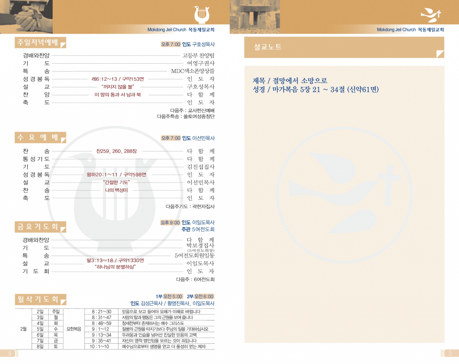 (월~토 1부 05:00, 2부 06:00, 주일 05:00~05:30)