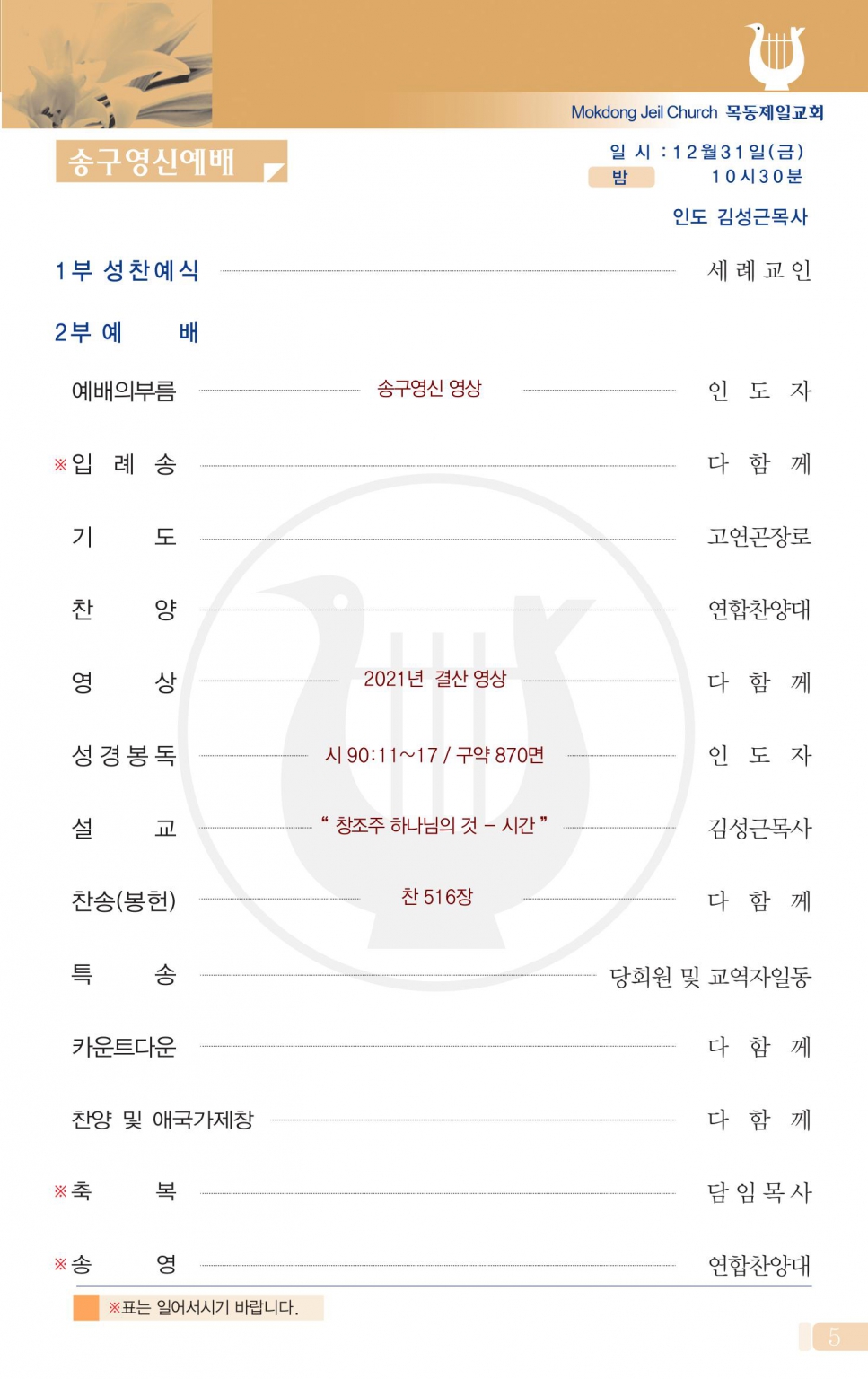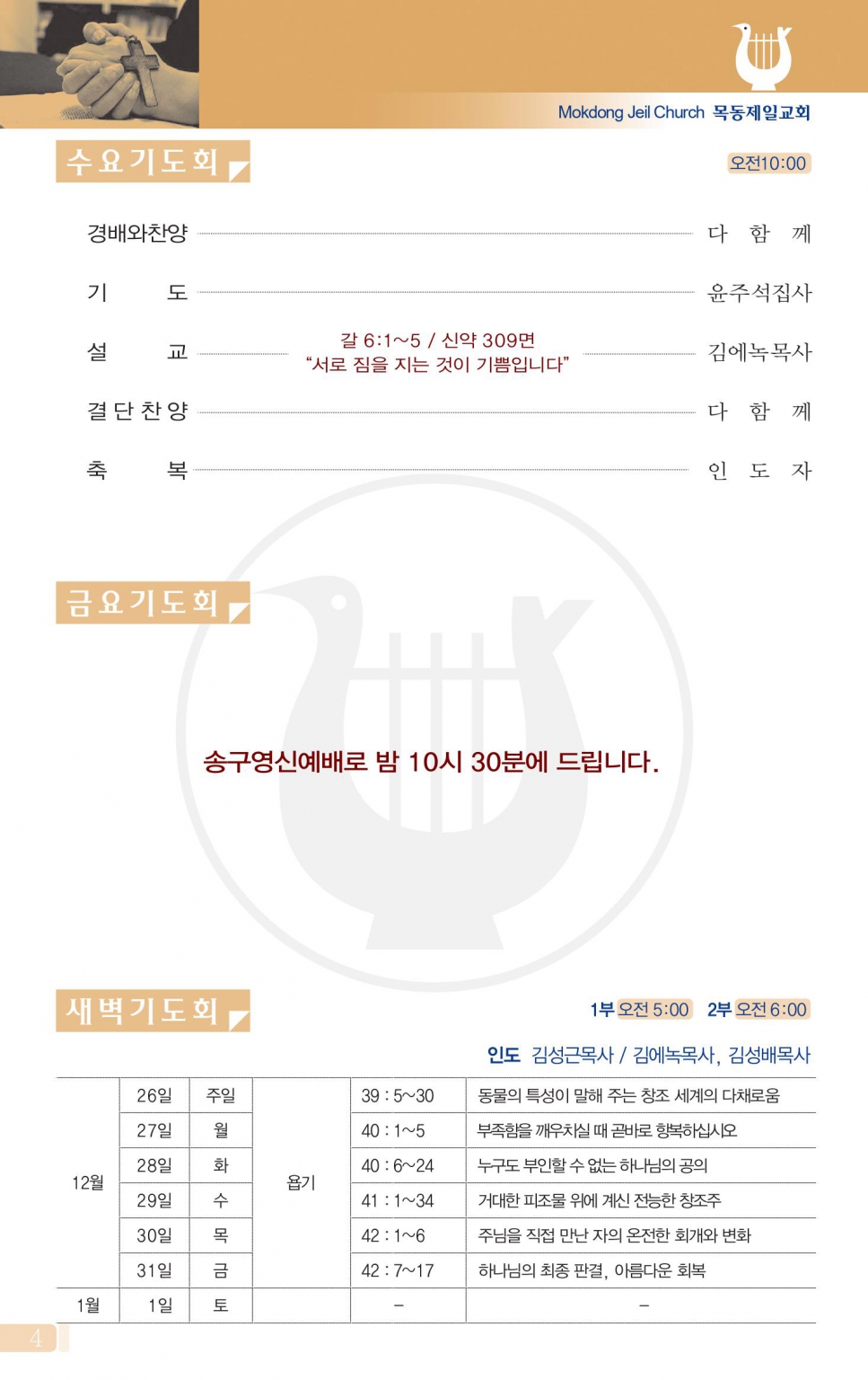 (월~토 1부 05:00, 2부 06:00, 주일 05:00~05:30)