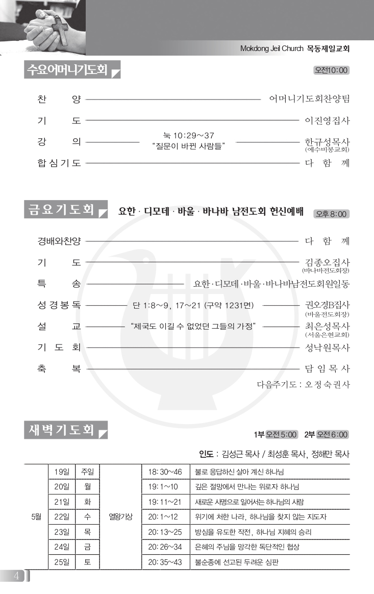 (월~토 1부 05:00, 2부 06:00, 주일 05:00~05:30)