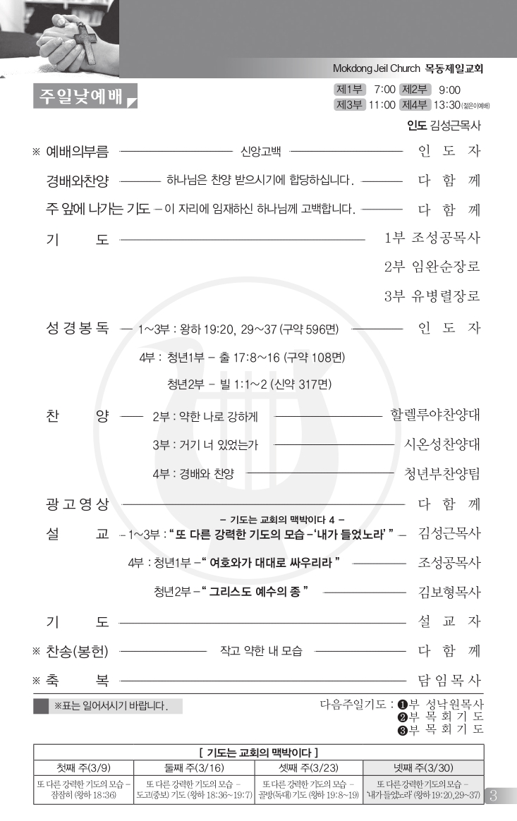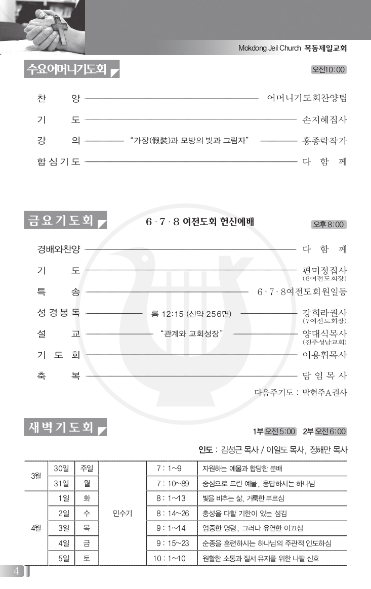 (월~토 1부 05:00, 2부 06:00, 주일 05:00~05:30)