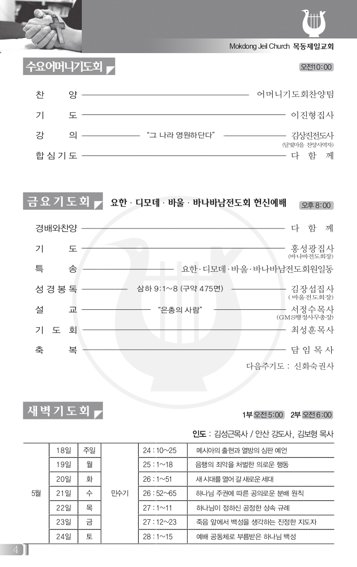 (월~토 1부 05:00, 2부 06:00, 주일 05:00~05:30)