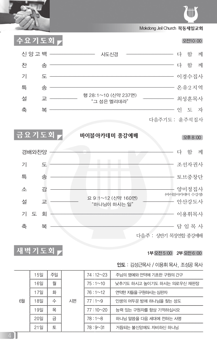 (월~토 1부 05:00, 2부 06:00, 주일 05:00~05:30)