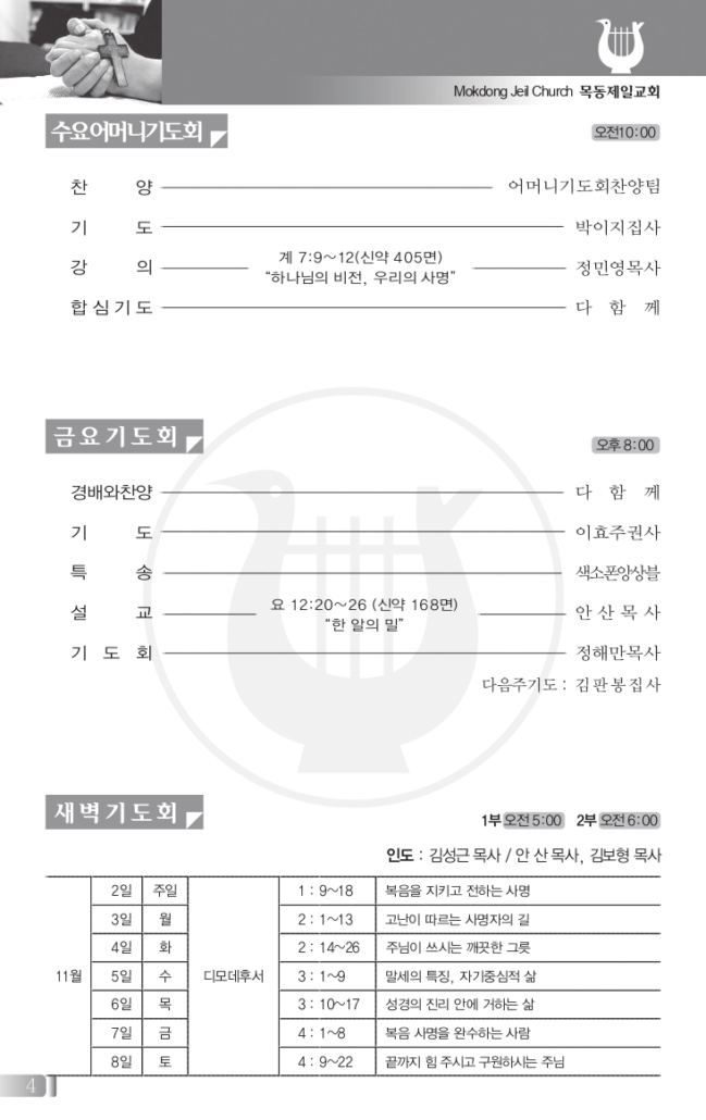(월~토 1부 05:00, 2부 06:00, 주일 05:00~05:30)