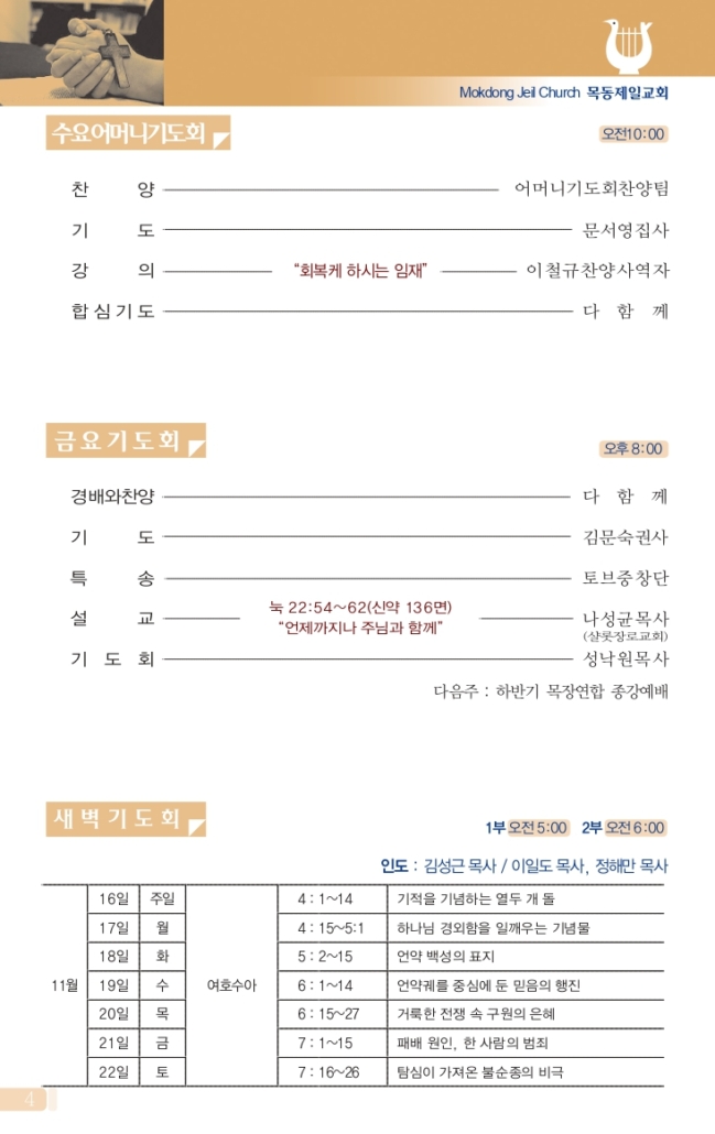 (월~토 1부 05:00, 2부 06:00, 주일 05:00~05:30)