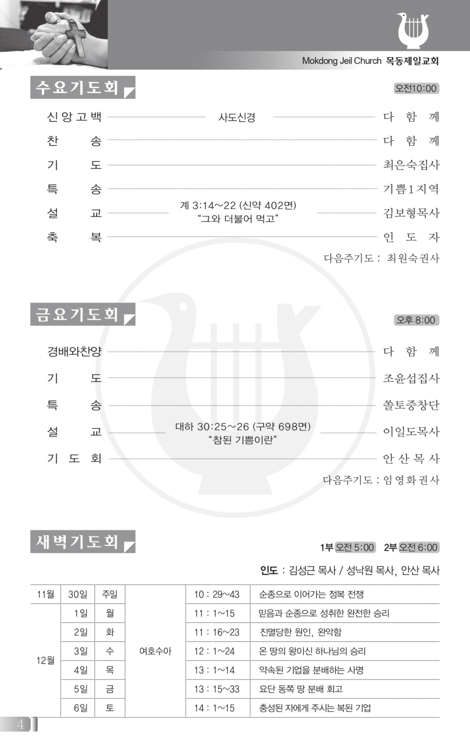 (월~토 1부 05:00, 2부 06:00, 주일 05:00~05:30)