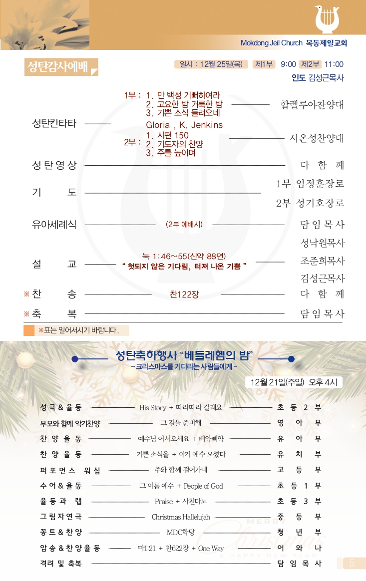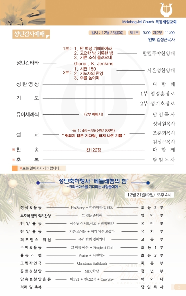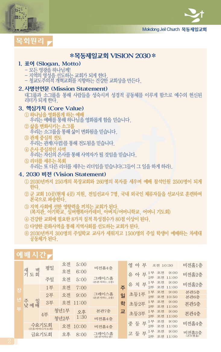 (월~토 1부 05:00, 2부 06:00, 주일 05:00~05:30)